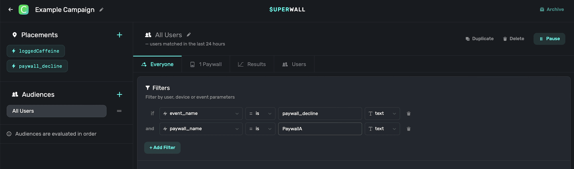 You can combine this with rules to show a paywall whenever a survey response is recorded or when the user gives a specific response. Again, add the standard placement survey_response to a campaign. Then, add another condition using survey_selected_option_title that's equal to the text of a particular response.