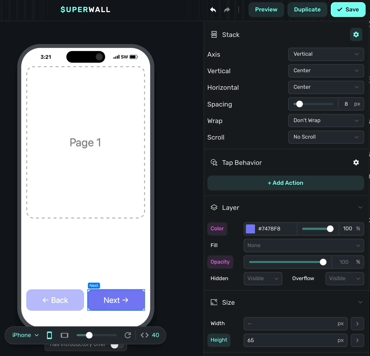 Each top-level child within the navigation component represents a current index value, starting from 0. Changing this value will change which page is displayed. In this example, we add a tap behavior to the button, which increments the element variable's current index value: