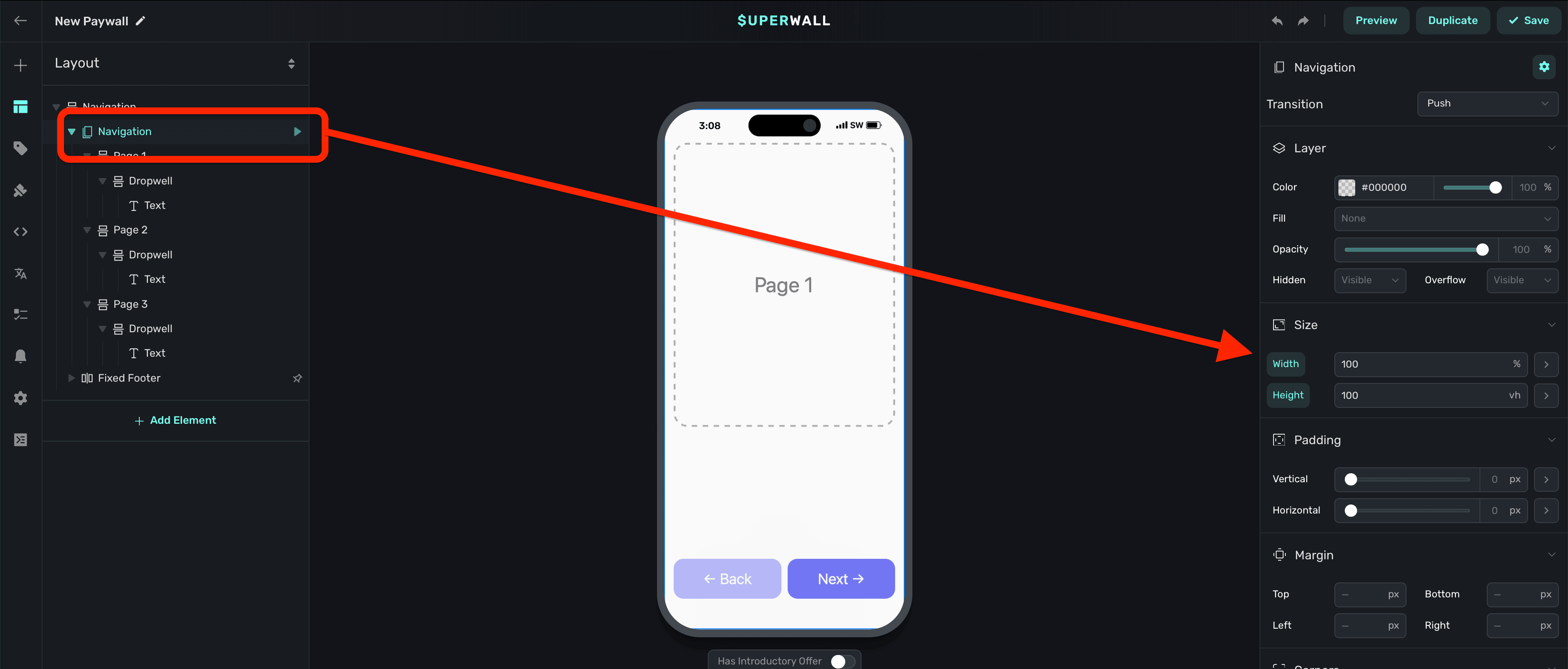 When a navigation element is added, Superwall automatically creates an element variable for it (accessed through the Variables tab in the left sidebar, or the variables button in the floating toolbar). Its name will match whatever is in the element hierarchy in the left sidebar: