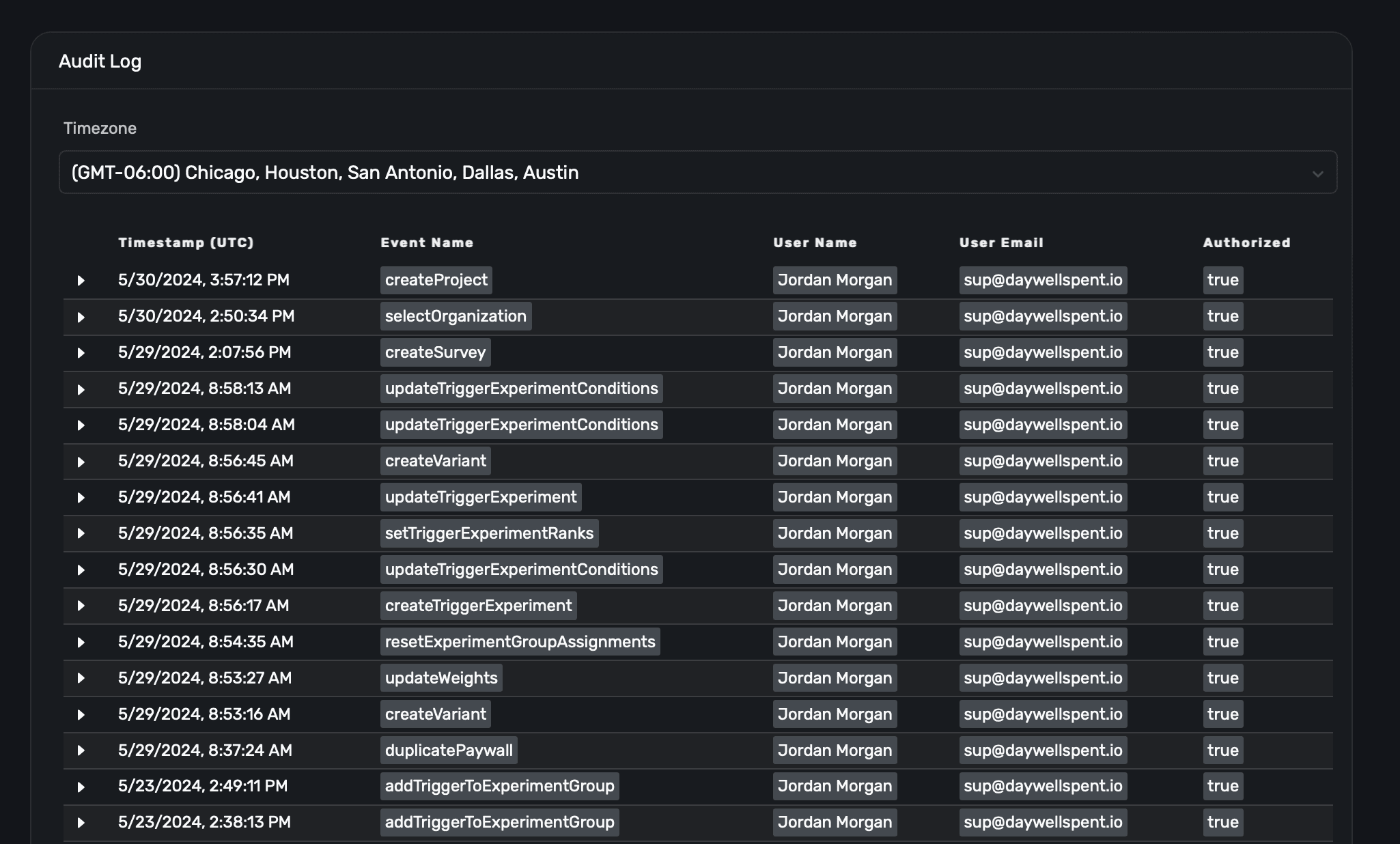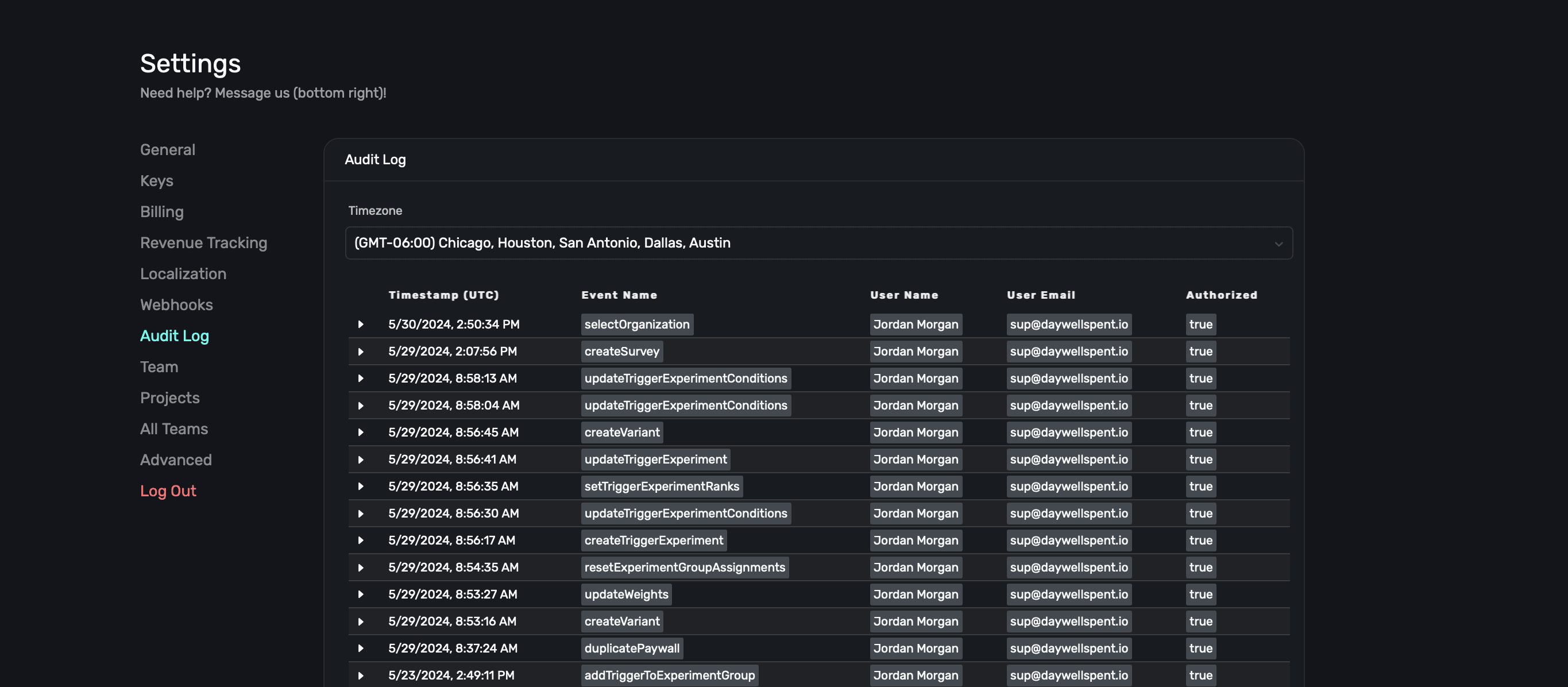 In the Audit Log section within Settings, you can view virtually any action taken by users within Superwall: