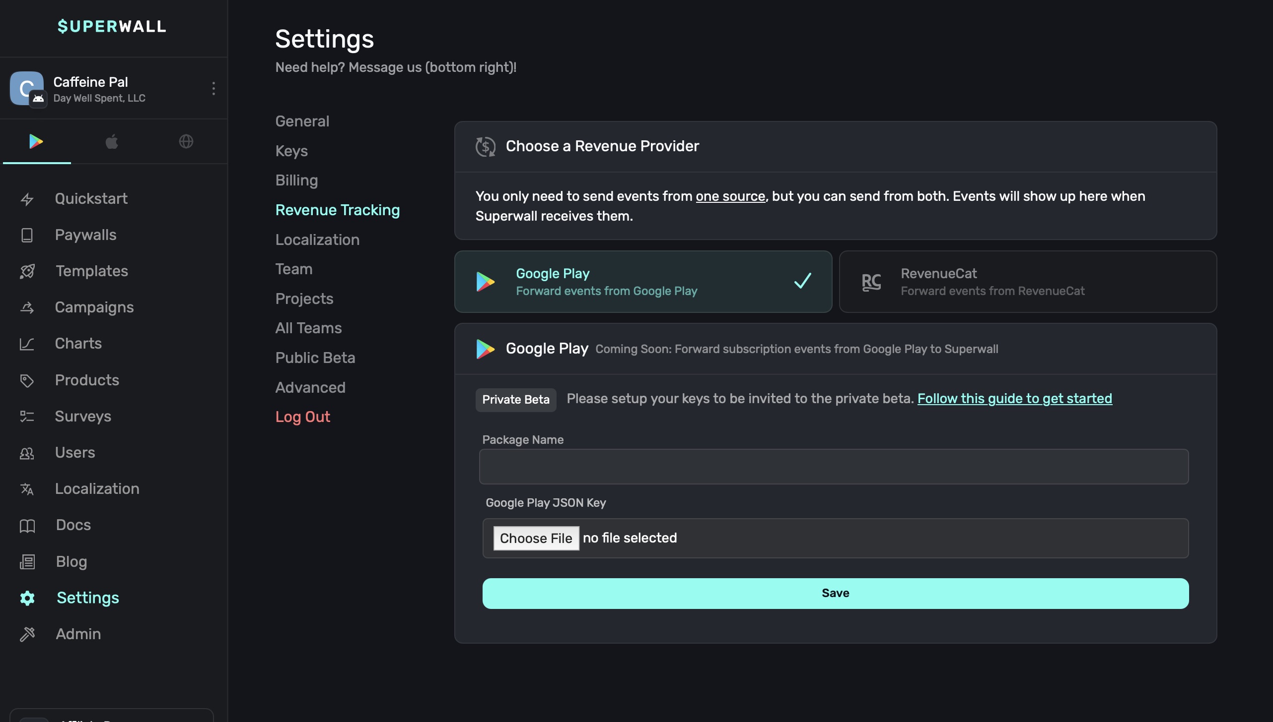 In the Revenue Tracking section under Settings, you can now setup Google Play Revenue Tracking.